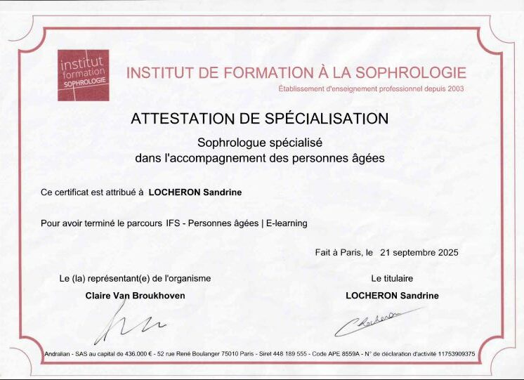Cette valeur m’a naturellement conduite vers la sophrologie, une discipline que j’intègre désormais à mon expertise pour accompagner les personnes dans leur équilibre global, plus une spécialisation accompagnement des personnes âgées