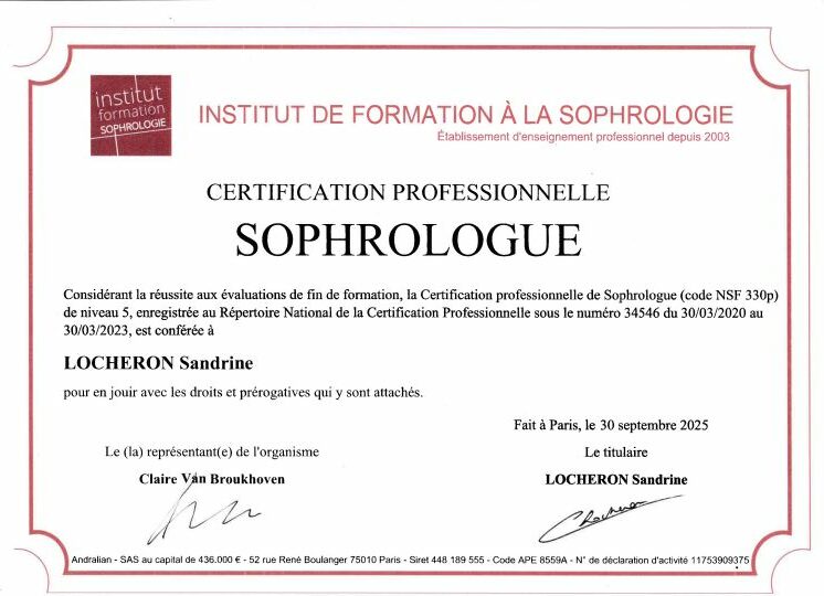 Je suis thérapeute en sophrologie, certifiée de l’Institut de Formation à la Sophrologie. L’IFS fût la première école à obtenir le label « Qualisophro » qui est un label qualité aux normes AFNOR. Ce label qualité est délivré par la Chambre Syndicale de la Sophrologie et vous garantit une qualité d’accompagnement.